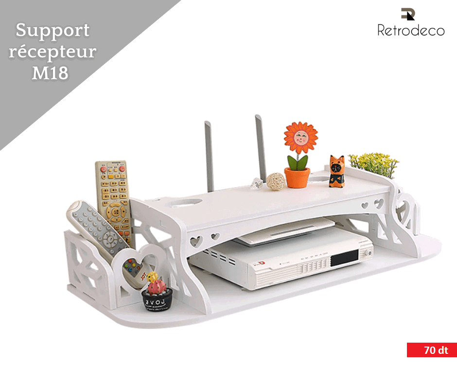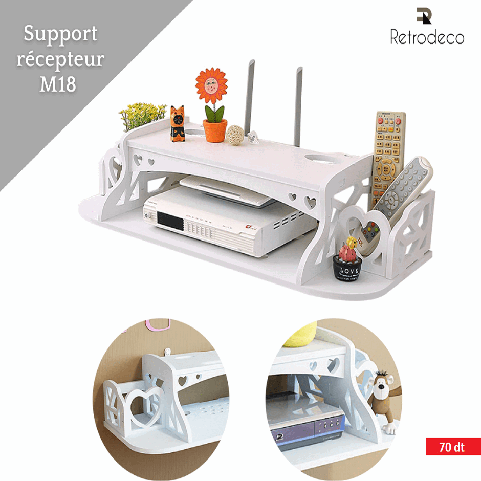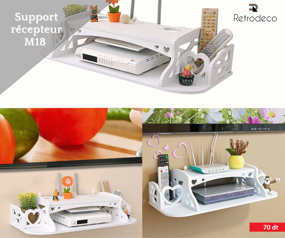 Optimisez votre espace tout en apportant une touche élégante à votre intérieur avec ce support mural multifonction au design moderne et soigné. Idéal pour organiser vos appareils électroniques comme le décodeur, le routeur ou la box TV, il vous permet de garder vos essentiels bien rangés et facilement accessibles. Sa structure robuste assure une excellente stabilité, tandis que son style décoratif s’intègre parfaitement dans n’importe quelle pièce, que ce soit le salon, la chambre ou même un bureau. Grâce à son installation murale, il libère de l’espace au sol et contribue à un environnement plus propre et mieux organisé. Pratique et esthétique à la fois, ce support est la solution idéale pour allier rangement, simplicité et gain de place au quotidien.